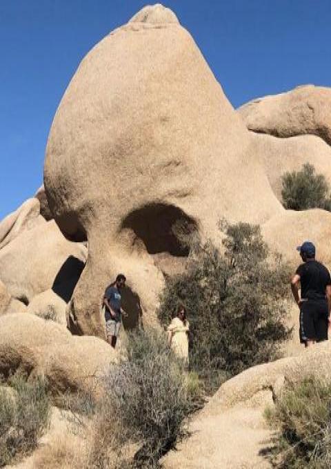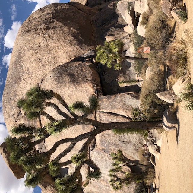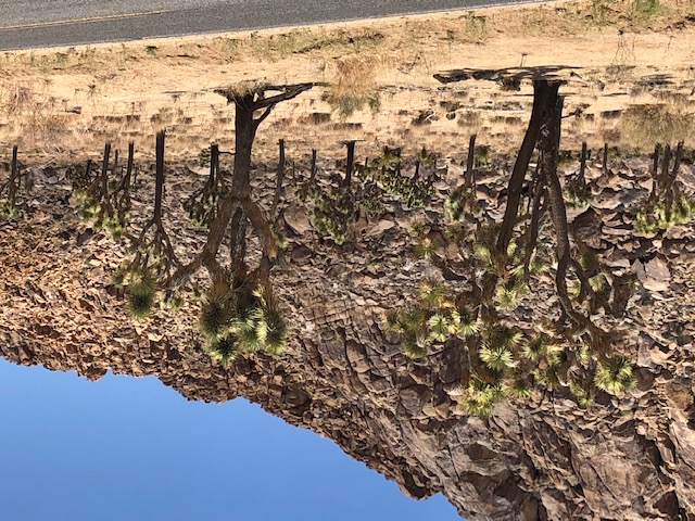 Although wildflowers bloom for a few weeks in the spring and plants like cacti, ocotillo, smoke trees, and brittle brush endure the extremes, the main flora is the Joshua tree. Mormon travelers in the 1850s came up with the name because this member of the agave family and dominant plant of the Mojave Desert looked like the prophet Joshua pointing them to the Promised Land. The trees grew – some up to 30 feet or more -- over a vast range thanks to the fertilization during the Ice Age by the giant 500-pound Shasta ground sloth that ate and then spread the tree seeds via its dung. Spring flowerings cause the random branching and infinite variety of shapes; after white flowers blossom at branch tips, the branch splits, then each branch splits again with another flowering. They look anguished, even haunted, but beautiful in their ugliness.
