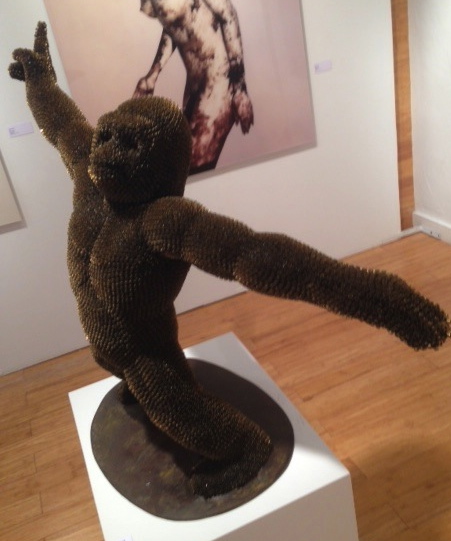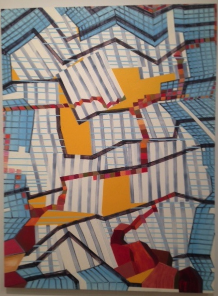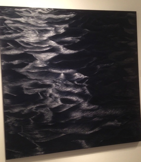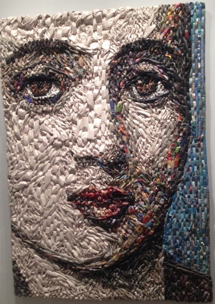 Some stand outs. . .Sebiha Demir constructs animal sculptures -- like a lively, funny gorilla -- with .22 bullet sleeves. . .The all-black paintings of Karen Gunderson conjure what appear to me as seascapes of undulating waves deep in the ocean. The American artist fashions illusions based on white light reflected off raised edges of varied brush strokes. . .Danish artist Gugger Petter specializes in larger-than-life mosaic-like portraits made of tightly rolled strips of newspaper woven together by a traditional loom. . .A work by Brooklyn’s Lisa Corrine Davis might seem like graffiti, but I saw a highly intricate, three-dimensional, geometrical bird’s-eye view of a cityscape with skyscrapers, plazas, parks, catwalks, and sidewalks.