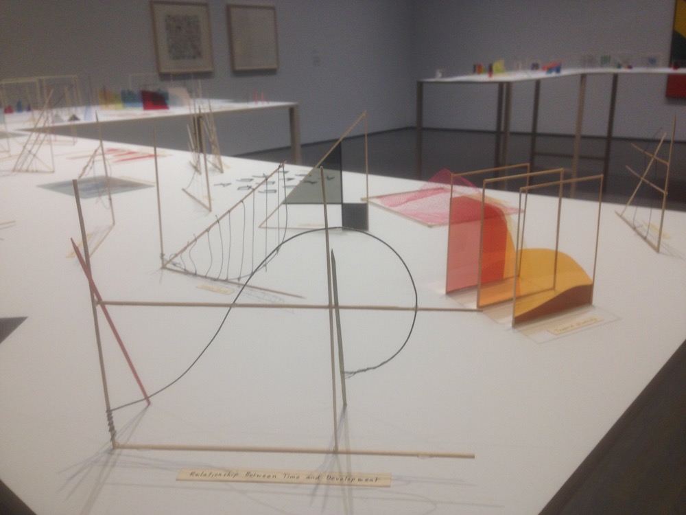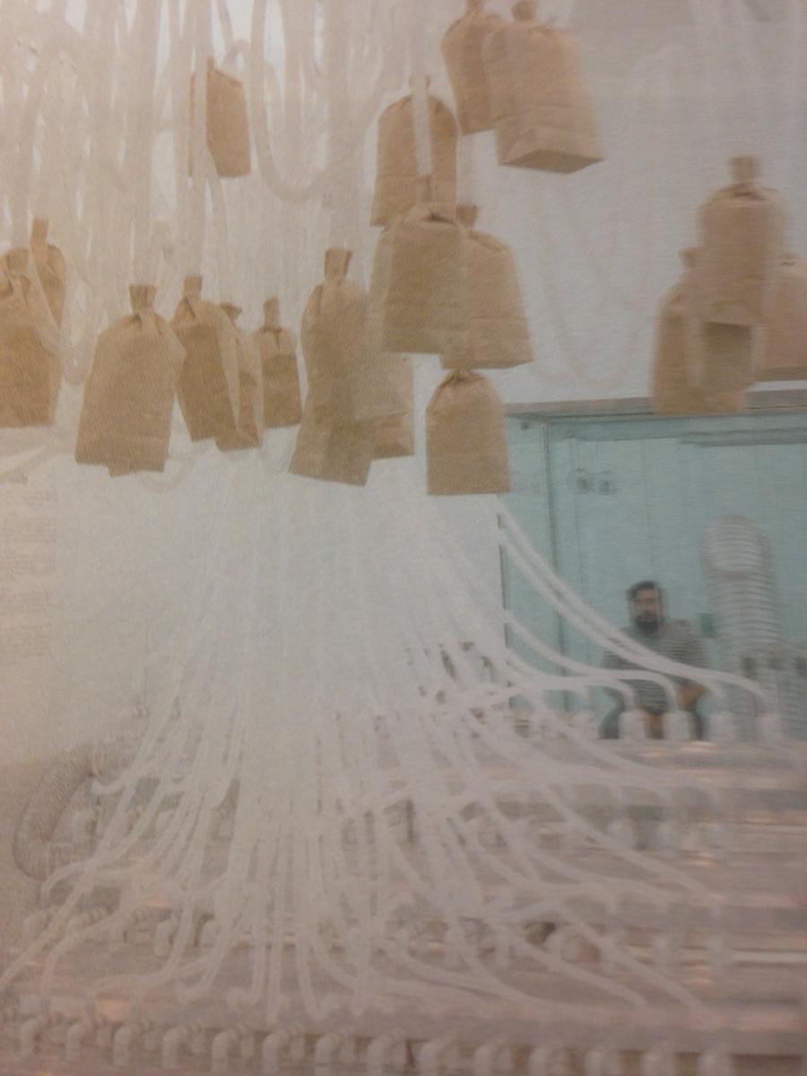 The Museum of Contemporary Art featured conceptual and thought-provoking interactive and immersive exhibits. In a room-sized installation Zoom Pavilion, we the participants became Big Brother. We were surrounded by projected black-and-white images of ourselves localized within the space created by 12 computerized surveillance cameras that track each one of us. Relatively quickly, each of our faces was screened onto three of the walls and the floor. A fourth wall archived the faces of all participants. Digital and visual data collection in action! Vicious Circular Breathing was a large sculptural installation that combines a scientific device with a gigantic musical wind instrument, similar to an organ. It looked like a giant technological lung that recycles air via motorized bellows, an electromagnetic valve system, and a tree-like arrangement of 61 paper bags hanging from respiration tubes. The Prophets posited that economists are modern-day soothsayers. The work consisted of 412 delicate hand-made abstract sculptures of string, bamboo sticks, wire, and acetate sheets fashioned into 3D models of economic graphs, charts, curves, and diagrams that economists have used to predict human behavior by analyzing how work, consumption, and production interact. The ironic and humorous tone of the descriptions (The Demand for Pollution, Buck and Doe Harvests, Altruism Levels) reflects skepticism of accuracy and understanding that such models are transitory.